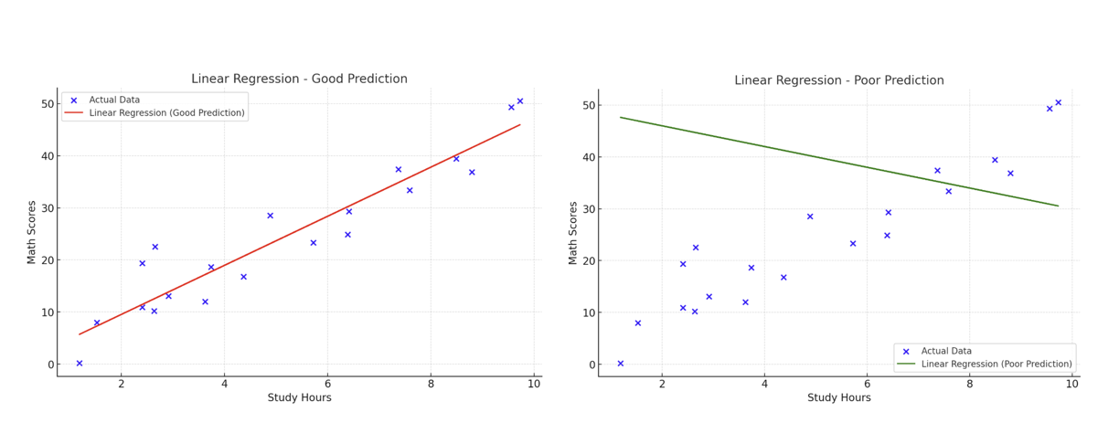 위 두 선형 회귀 결과를 비교해보았을 때, 어느 직선이 데이터를 더 잘 대변하는가? 좌측 plot이 더 산점도를 잘 표현하고 있음을 육안으로 확인 가능하다. 그렇다면 과연 데이터를 잘 대변(표현)하는 직선을 어떻게 찾을 수 있을까? 직선이 데이터를 잘 대변한다는 것은 어떤 기준으로 확인 가능할까?