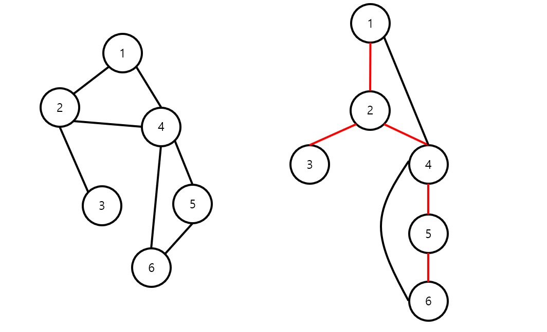 왼쪽 그래프에서 Tree Edge를 빨간색으로 표시하여 오른쪽에 나타내었다. 각각의 정점에 대해 low 값을 구해보면