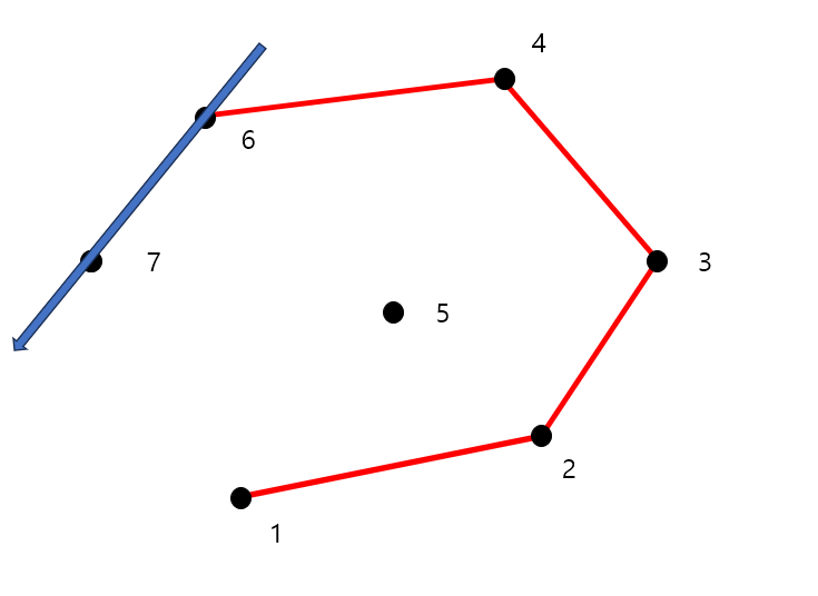 $7$번 점은 $4$, $5$번 점을 이은 벡터의 왼쪽에 있으므로 stack에 push해준다.