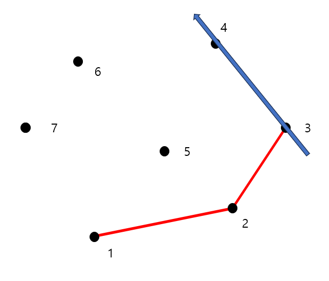 2. stack에 $1$, $2$번 점을 넣어준다. 그리고 $3$번째 점부터 탐색을 해주는데 만약 $i$번째 점이 stack 최상단에 있는 두 점을 이은 선분 l의 왼쪽에 있으면 stack에 넣어주고 아니면 stack을 pop한다. 위 그림에서 $1$, $2$번 점을 stack에 넣고 $3$번 점부터 계산을 해보면