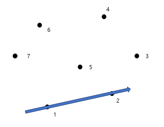 1. 점들을 반시계방향으로 정렬한다. 아래 그림은 $1$번 점을 기준으로 반시계방향으로 정렬한 것이다. 이 번호 순서대로 점들을 탐색할 것이다.